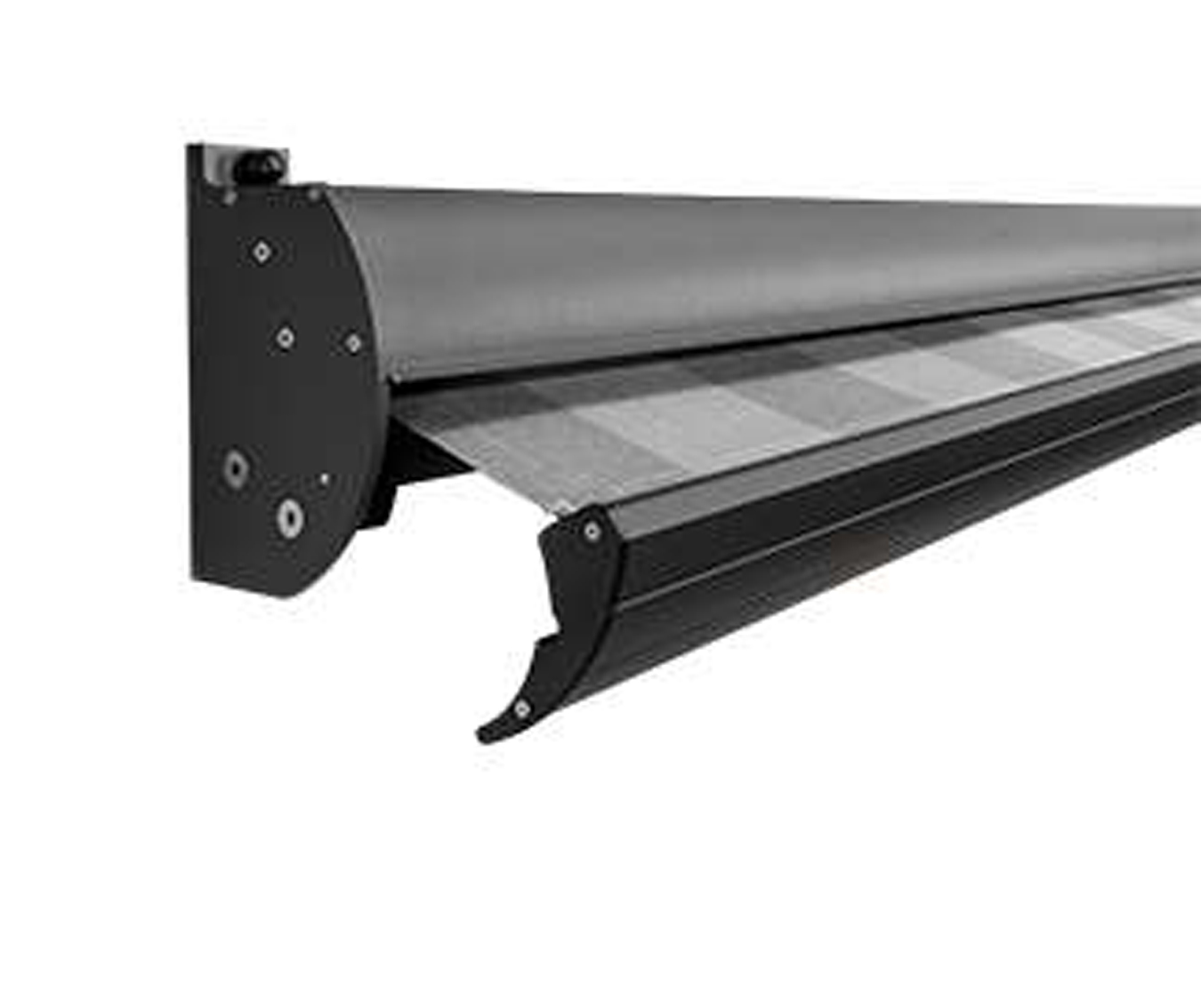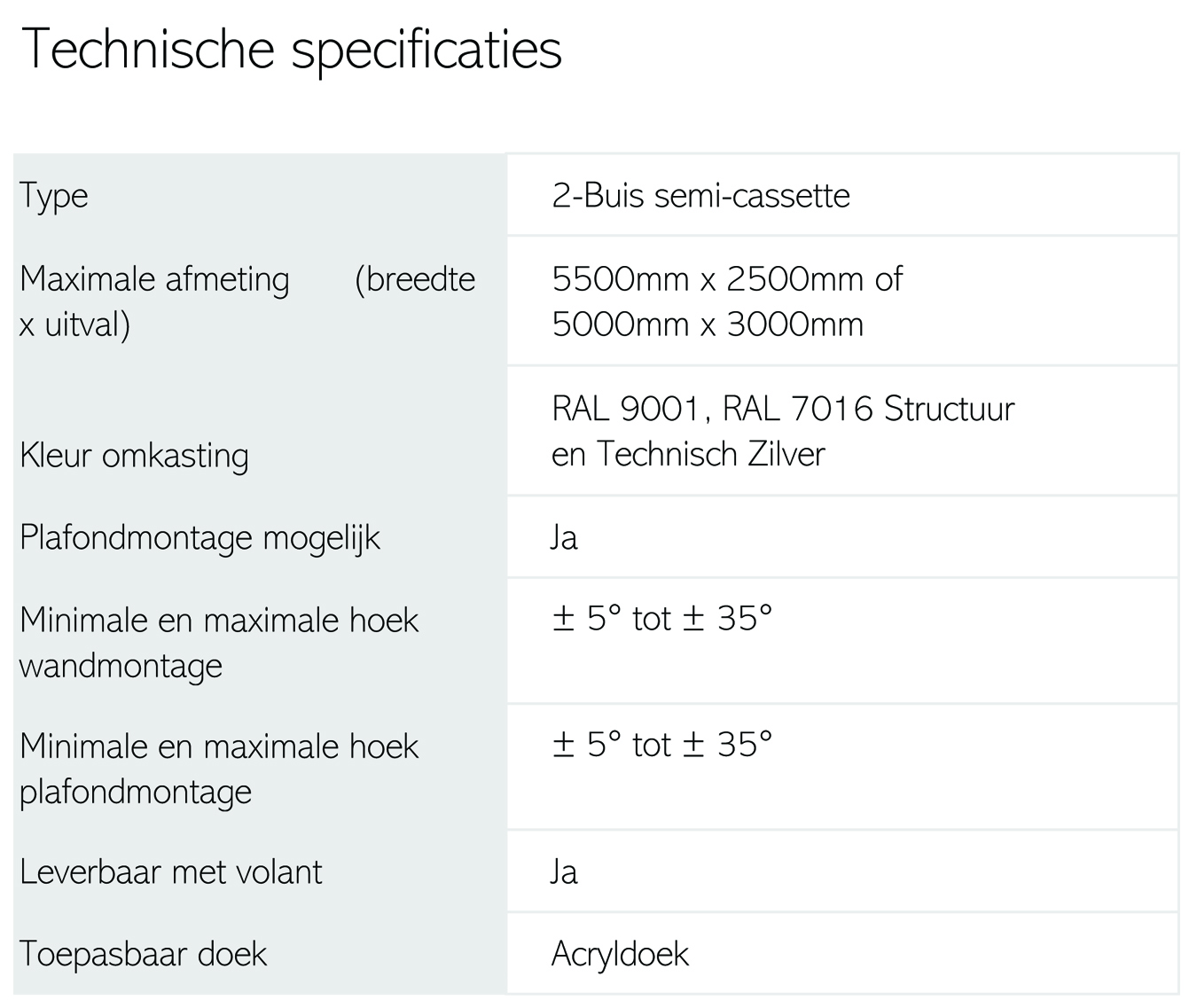 Tot en met een breedte van 4500 mm is de Picca met slechts twee steunen te monteren. Naast montage tegen de muur behoort ook plafondmontage tot de mogelijkheden van dit terrasscherm.