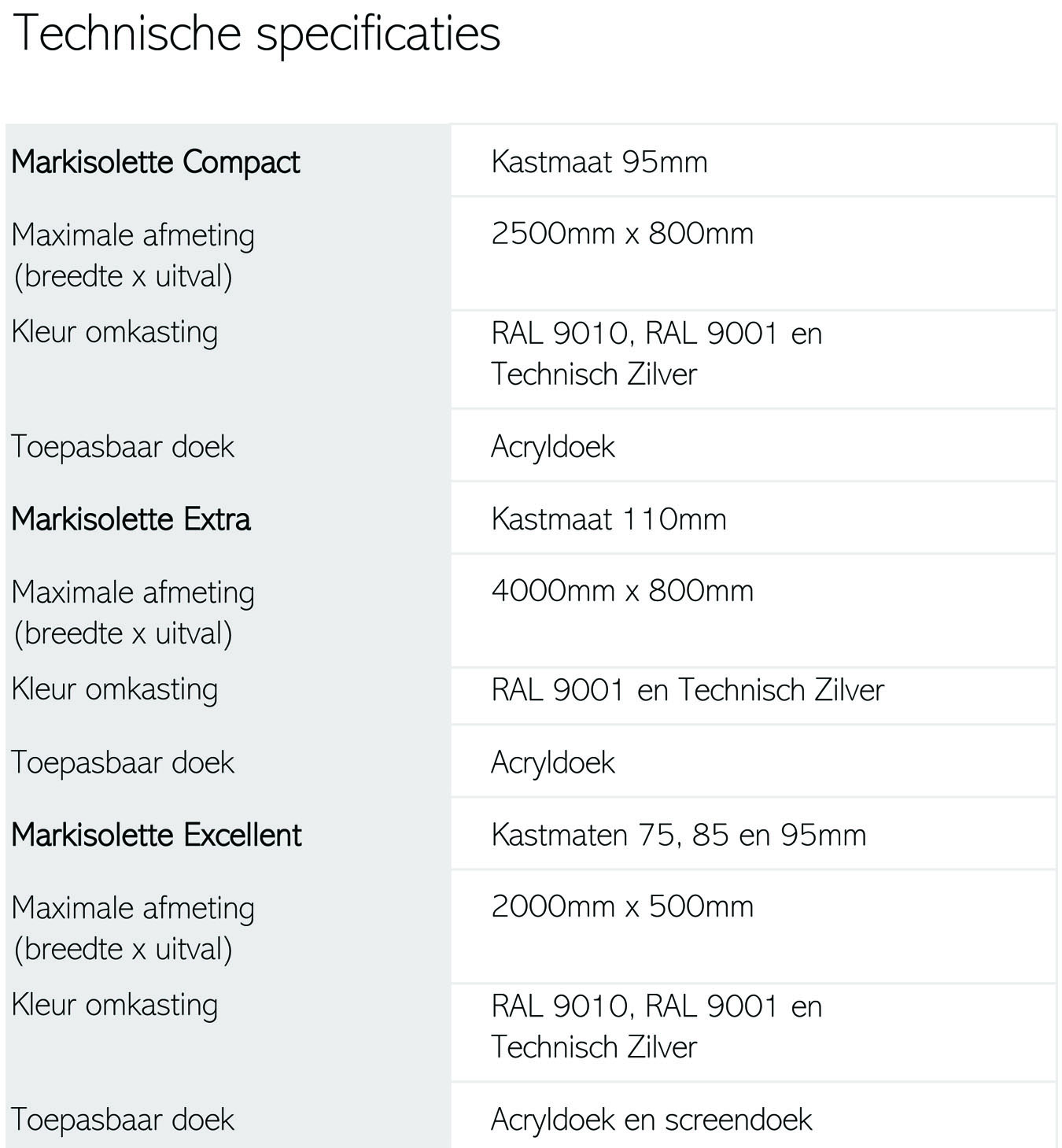 Kenmerkend aan dit type valarmscherm is de compacte omkasting. Deze is zeer eenvoudig in een nis of koof te plaatsen, waardoor het scherm amper zichtbaar is. Naast toepassing op huizen en appartementen is de Markisolette Compact een populaire buitenzonwering voor projecten, zoals verzorgingstehuizen, kantoren en ziekenhuizen. Ook op scholen wordt deze zonwering veel toegepast ter bescherming tegen hinderlijk zonlicht.